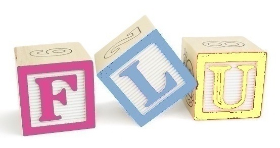 Alphabet blocks forming the word ‘FLU’ and viewed from the front and slightly to the left. The L block is tilted.